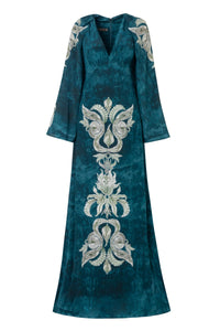 Long-sleeved Silk CDC blue gown with localized print in the center and sleeves. The soft CDC silk touches your body allowing you to experience fluidity and comfort.
