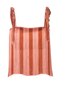 Red and Pink striped fringed Crop Top, tied at the back. Its straps have handmade knots made in the same fringes. It has 1 layer of fringes creating a unique and fluid movement when walking or dancing. Its base is made of Silk CDC, a soft and matte natural textile. Without a doubt, it will become a special piece for you.