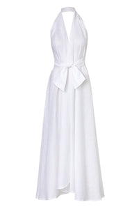 Halter dress with a long flowing skirt. It has a bow at the waist. It is made of linen, a natural fiber textile.